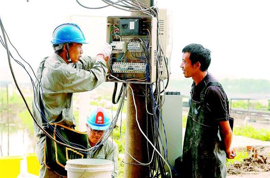 湖北日报讯 15日,国网潜江市供电公司工作人员在后湖农场张家窑分场对小龙虾养殖户用电设备进行维护。今春以来,该公司主动服务经济主战场,先后组织供电人员为2000多户水产养殖户维护用电设备,新增变压器40台,新增、改造线路68千米。 (视界网 李毅 鄢明惠 摄)