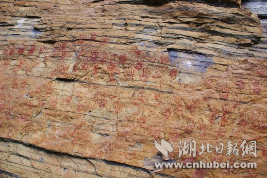 在长江巫峡段的天子岩山顶(位于巴东县官渡口镇),数百米高的岩壁之上,400多枚“血手印”横空出世,赫然屹立于凹凸不平的岩石之间。手印鲜红,色泽与岩石融透,有些手印甚至连指纹都清晰可见。虽历经风蚀雨剥,至今却形状完整、血色依旧。向勇说,这些神秘“血手印”都由真人拓印而成,应是古代巴人所为。但具体起源何时、如何绘制?又蕴藏着什么玄机,或尘封着怎样一段鲜为人知的历史,众说纷纭,成为世界岩画专家研究和争论的热点。