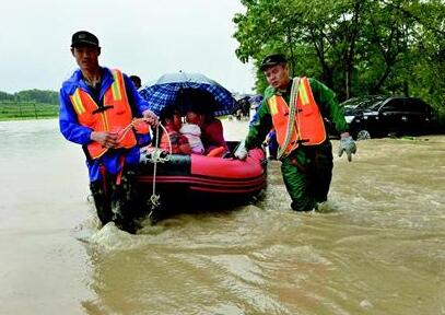 图为:通城四庄乡小井村道路被洪水阻断,消防划艇转移村民
