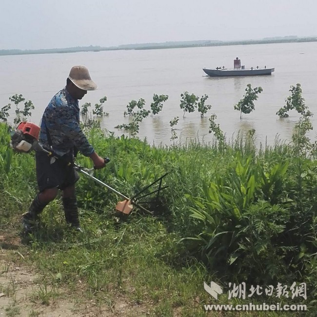 站在簰洲湾堤上,只见江水宽阔,水质混浊,岸边的防浪林树干已被淹没大半,只露出一蓬蓬的树枝。原本空旷的堤顶公路,多了一些哨棚。内岸边,星散分布的群众,手持镰刀或除草机,正在忙碌地清障除杂。每隔一段距离,都有一个防汛哨屋,鲜艳的五星红旗迎风飘扬,各个分指挥部已经设立。