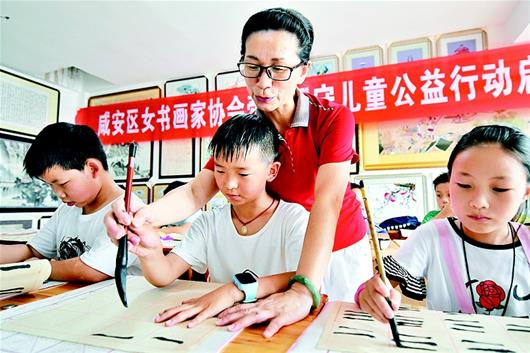 湖北日报讯 今年暑假,咸宁留守儿童有了新去处,该市一批书道精湛、和蔼可亲的女书法家免费教他们学习书法。咸宁市咸安区女书画家协会去年成立,一直坚持周末及寒暑假设立两处书法授课点,对周边留守儿童免费开放。(记者刘曙松 视界网李旻媛 摄)