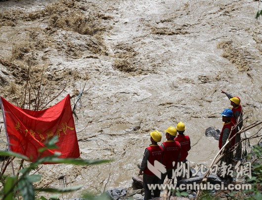 图为:国网五峰县供电公司党员服务队正准备过河抢修采花乡宋家河10千伏线路。(通讯员郑超摄)