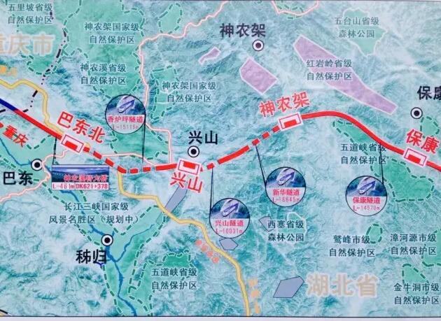 郑万高铁(郑州—万州),是郑渝高铁(郑州-重庆)的重要组成部分,郑万铁路湖北段正线长度287.187公里,设计速度为350公里/小时,在湖北境内设襄阳东津、南漳、保康、神农架、兴山、巴东北等车站。2016年11月,湖北段建设已全面启动。