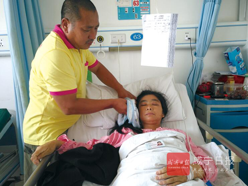 7月28日,记者在崇阳县人民医院住院部内科,见到正在照顾妻子的杨寿昌。