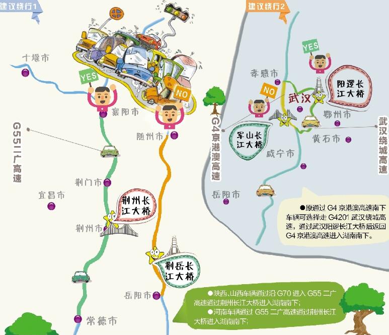 ●原通过G4京港澳高速南下车辆可选择走G4201武汉绕城高速,通过武汉阳逻长江大桥后返回G4京港澳高速进入湖南南下。