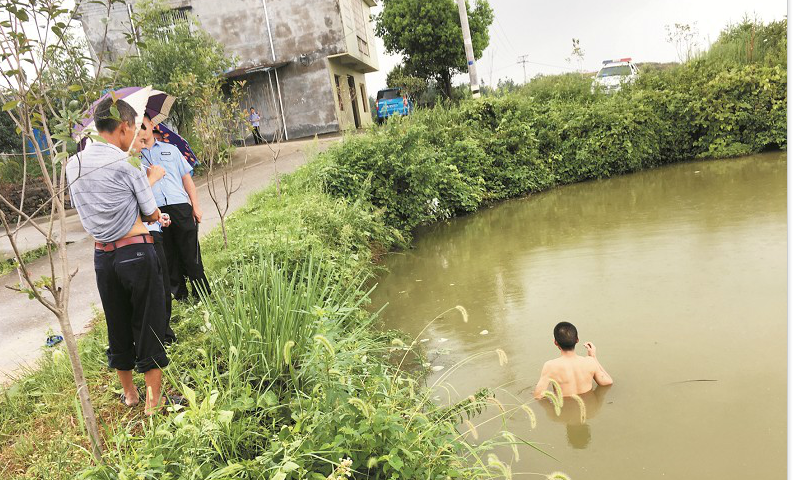 楚天都市报讯 图为:万某在水塘里游来游去不肯上岸