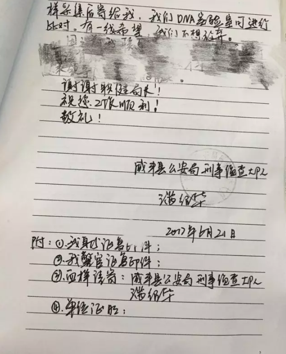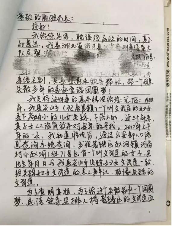“尊敬的职健局长,您好!今来信无别,只想恳求领导帮一个失散多年的家庭重温团圆梦……恳求领导安排人将贵辖区的文伍莲血样采集后寄给我,我们DNA实验室可进行对比。只要有一线希望,我们都不想放弃!”