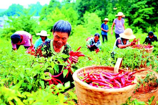 湖北日报讯 8日,宣恩县李家河镇金陵寨马铃薯专业合作社社员正在采摘辣椒。该合作社组织村民入社,通过土地流转、土壤改良实现规模化种植,并由一年一季种植玉米向一年四季种植大头菜、马铃薯、辣椒转变。如今,亩均年收入可达1.2万元,是过去的20倍,新的种植模式让村民尝到甜头。
