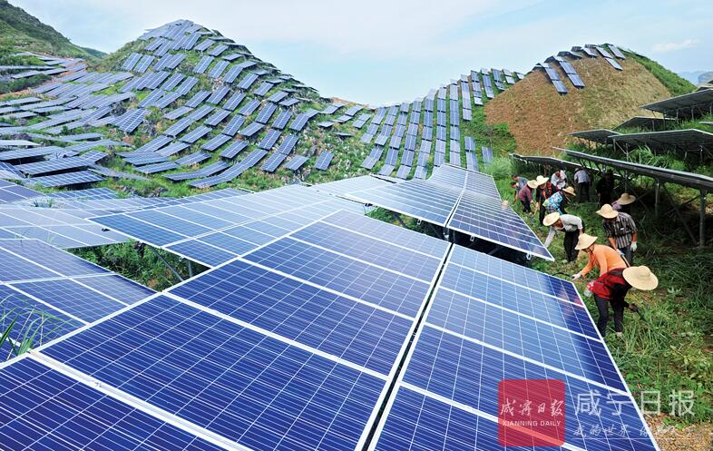 10日,在通山县燕厦乡理畈村地面光伏发电站,当地村民在为电站除草。