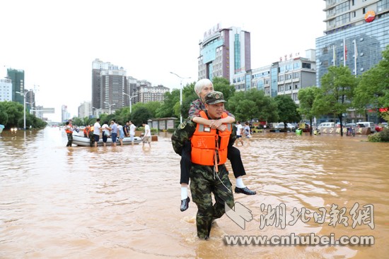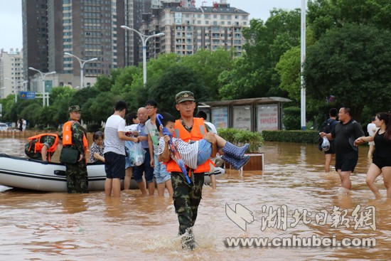 湖北日报网讯(通讯员何智利、何彦卿、记者江卉)8月11日20时至8月13日12时,咸宁地区普降大到暴雨,局部特大暴雨量达204.7毫米。强降雨导致城区咸宁大道、银泉大道、玉泉街、书台街等多条城市主干道严重积水,造成严重内涝。8月13日13时许,武警咸宁支队接到任务后,支队长廖光明率50名官兵,出动车辆6台、救援绳20根、皮划艇3艘,转移受灾群众300余人,转运受损抛锚车辆20余台,疏通城市主干道5条。截止13日18点,武警官兵还在一线救援。