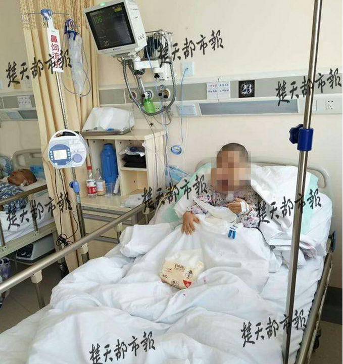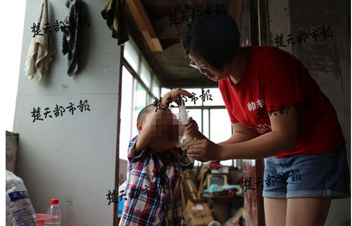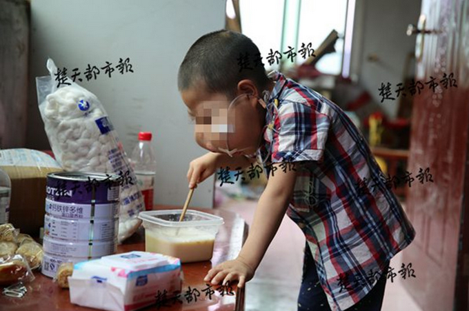 中午,妈妈田淑升下班回来了。在县城一家厨具店打工的她每天都准点到家,佳欣吃饭有点复杂,必须她亲自来弄,不然不放心。冲好牛奶,田淑升把佳欣脖子上的一根小套管取下,放在碗里用热水清洗,“这个得每天取下来消毒清洗,不然就会被痰堵住。”用注射器吸出牛奶,田淑升小心翼翼往佳欣嘴里注射进去,“孩子无法吃饭,只能这样注射流食。”每日只能靠注射流食维持生命,其他的营养几乎都无法跟上,一个月下来,一向胖乎乎的田佳欣,变得消瘦如柴。望着仰头吞牛奶的小佳欣,田淑升眼泪在打转,“这孩子命真苦。”从一出生,疝气、肠道扭曲再到巨颌症,小佳欣一直饱受病痛折磨,生与死的较劲从未退却。2016年11月,在社会的帮助下小佳欣顺利完成第一次颌骨切除手术。那阵子小佳欣瞬间找到了童年的味道,跟着外婆邹红回到老家茶店子镇燕子岭村,无拘无束的乡村生活让他轻松自在。但幸福时光稍纵即逝,厄运再次降临。今年4月,“脸蛋肿胀”、“呼吸困难”这些症状再次发作,而且更严重。很快,小佳欣快速肿胀的脸蛋把鼻孔挤成了两个小孔,每吸一点气如同打呼噜一般,随时都有窒息可能。