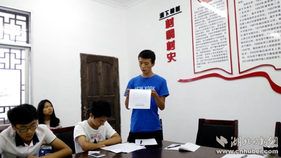 湖北日报网讯(全媒体记者李彦睿、通讯员严斌)8月25日,恩施市白杨坪镇洞下槽村大学生代表朱山宣读致全国贫困地区大学生的倡议书,倡议全国贫困地区的大学生们为自己家乡的建设和发展尽一份力。