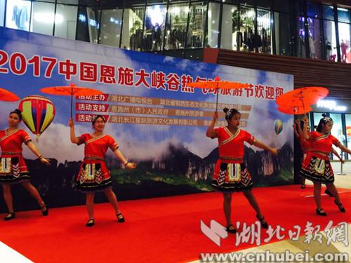 此次恩施大峡谷热气球旅游节推荐会现场,不仅介绍了恩施主要景点的特色风貌,还在展出了大量自然风光图片展和土家歌舞,让在场市民提前领略恩施风土人情。