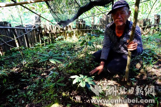 这位69岁的土家族老人名叫谭银轩,长年在人迹罕至毒蛇出没的深山溪谷中放牛,顺便采挖野生重楼补贴家用,见到重楼野生资源越来越少,就尝试在咸丰县的莽莽大山中栽培,经过十余年的探索,在农业专家指导下,利用块茎入土催芽等技术,结合遮阳网配套模拟生长小气候,经过10余年反复试验,终于摸索出了一整套重楼野转家栽培技术,现已栽培重楼上万余株。下一步,咸丰县林业部门将推广这一成果实施大规模的野转家种植。