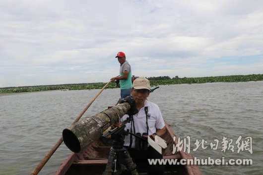 雷刚博士乘坐小船在返湾湖监测、拍摄鸟类。