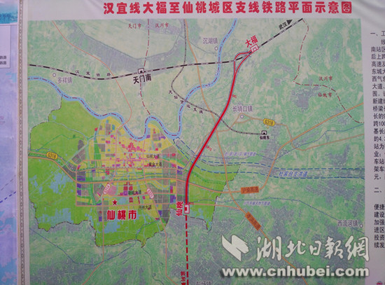 汉宜线大福至仙桃城区支线铁路自汉宜线汉川站至天门南站区间(大福)接轨引出,先后上跨在建的江汉平原铁路、孝洪高速、G318国道、在建东城大道、汉江杜家台分洪道、西气东输管道、沪蓉高速进入仙桃站范围。新建线路16.692公里,设计行车速度200公里/小时,项目总投资约26.85亿元,建设总工期36个月。