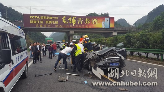 当日下午15时20分许,向鹏飞与司机在返回利川途中行驶至沪渝高速白果坝互通4公里处,看到前方大量的汽车排成长龙,并且有高警车辆响起了刺耳的警报声,他猜测很可能是发生了交通事故,他当即命令司机将车辆驶入应急车道上前查看。经过两分钟的行驶后发现,前方有一辆小轿车追尾一辆大型货车,小轿车的车头和货车厢体严重变形,杂物散落一地。