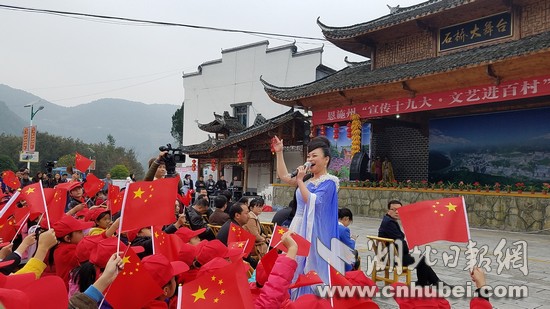 湖北日报网讯(全媒体记者李彦睿)25日,恩施州“宣传十九大·文艺进百村”活动在全国文明村——巴东县野三关镇石桥坪村启动。2个小时的首场演出,博得群众喝彩。