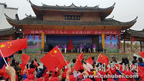 恩施州委宣传部长尹达介绍,“宣传十九大·文艺进百村”活动从今天起到明年6月底,在全州100个村陆续开展,用丰富多彩的文艺演出形式,把十九大精神宣传到老百姓中去。