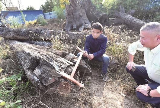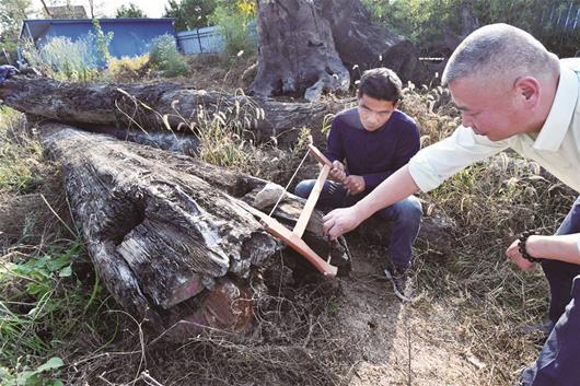 昨日,记者随几位园艺、文物专家赶到嘉鱼县城雷军的家具厂,只见一根木头分成两截堆放在草地上,呈黑色,有厚厚树皮,两头还各有一个为方便绳索捆绑打的树洞。经测量,长19米,最宽直径70厘米。