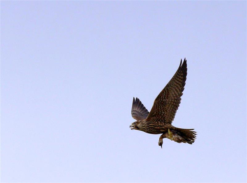 图一、游隼叼起小鸊鷉凌空飞去(朱明摄)