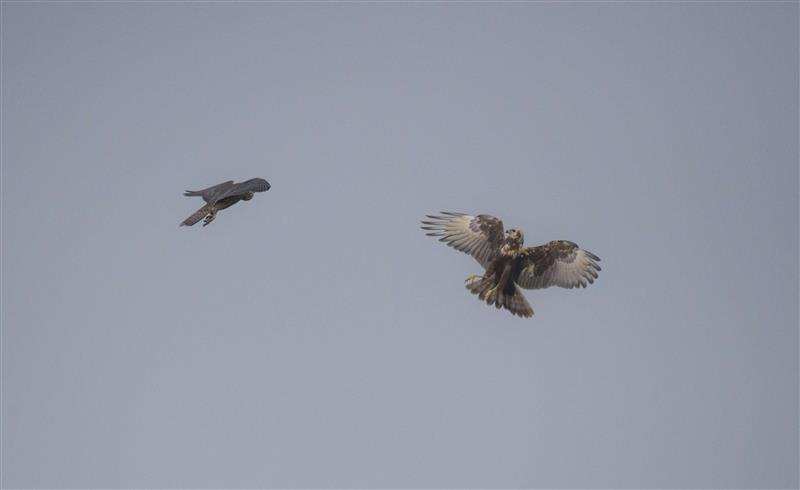 图三、游隼(左)和白腹鹞(右)争夺领地(方兵摄)