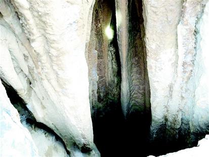 其中一个溶洞位于界水岭村四组,小地名叫狮子磅,因山包上一块巨石酷似仰天长啸的狮子而得名,洞口就在新修的路边。楚天都市报记者看到,挖开的洞口直径约60厘米,里面深不见底,记者试着丢了块石头,只听见一连串石头撞击洞壁的声音。村民找来强光电筒,依然无法探到底。记者看到,洞壁上尽是石钟乳,向洞底延伸不见终端,洞壁上有几处石钟乳呈人形。