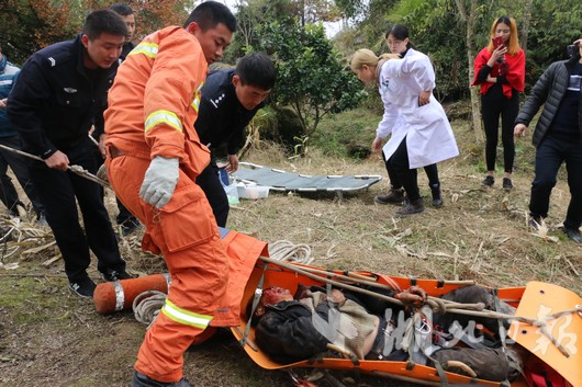 侦察结束后,中队指挥员立即下达作战命令:由中队救援经验十分丰富的两名战士下到地缝的底部实施救援,其余人员在上面进行安全保护。接到任务分工后,参战官兵立即各就各位投入战斗,14时23分,第一名救援官兵穿戴好个人防护装备到达了地缝底部,探明了地形,对被困人员进行了简单的安抚询问;14时26分,第二名救援官兵到达地缝底部,两名救援官兵经商讨,立即联系指挥员采用“绳索升降”的方式向地缝底部运输救援装备。随后,中队两名救援官兵用多功能救援担架以及全身吊带将被困人员固定,并利用两根安全绳采用“上拉下拽”的方法一点一点把被困人员从地缝底部拉上来。