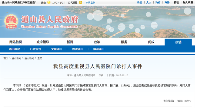 据通山县委宣传部通报:2017年12月8日中午,通山县人民医院门诊输液室发生打人事件 ,通山县公安局及时出警调查取证。事件发生后,通山县委、县政府高度重视,组建专班进行处置,召集县政府应急办、 公安局、卫计局、县人民医院等部门负责人会议:由县人民医院院长成忠了负责组建医疗专班,做好治疗护理工作;由县 人民政府副县长金大德负责组建公安调查专班,确保处置及时快速、公平公正。该事件正在调查处置中,处置结果将及时 向社会公布。