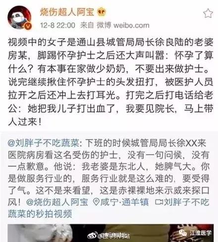 此前,有网友曝料称,湖北咸宁通山县某局长妻子房某带儿子打针,护士拔针时有点出血,房某认为护士态度不好发生口角,随后脚踹护士致其先兆流产。