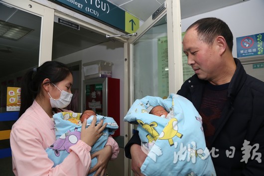 怀孕32周时,两个胎儿的压迫使方志英几乎无法躺下来,呼吸也变得急促。因担心出现突发状况,12月12日,庞方国带着方志英来到武汉大学中南医院。产科主任李家福教授检查发现,方志英还有心功能不全、妊娠期糖尿病,建议立即进行剖宫产。14日上午,方志英成功生下一对龙凤胎,体重都是2.2公斤。由于是早产儿,出生后被送入新生儿ICU。