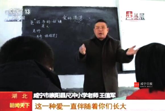 在刚刚过去的元旦佳节,央视《朝闻天下》栏目播出了一则《大山里的摆渡老师》的新闻,在本地教育系统刷屏。新闻的主人公就是崇阳县尺冲小学教师王值军,在这则近8分钟的新闻里,记录了王老师接送学生上下学、上课、走访留守儿童家庭等日常工作生活常态,展现农村教师坚守大山,关爱学生的高尚道德情操。