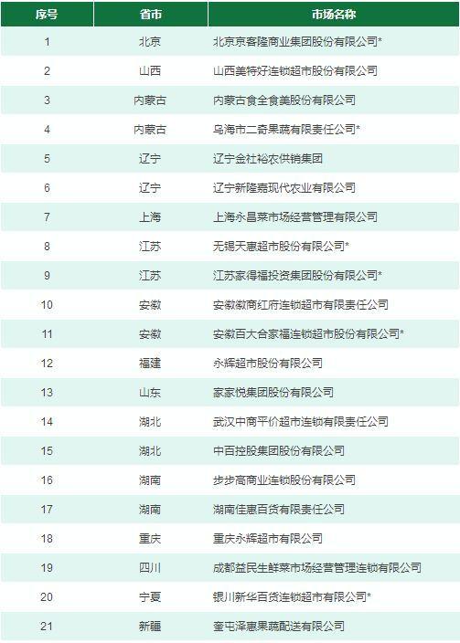 商务部对2017年31家示范市场进行动态调整,取消4家示范市场资格,新增22家示范市场,最终确定了28家农产品批发市场和21家零售企业为全国公益性农产品示范市场。