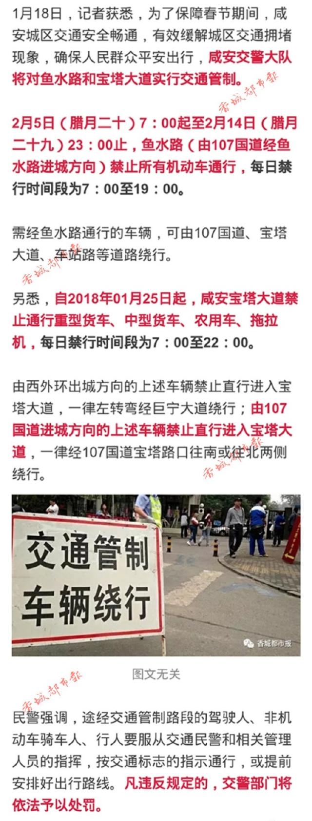 18日悉,为保障春节期间,咸安城区交通安全畅通,咸安交警大队将对鱼水路和宝塔大道实行交通管制。途经交通管制路段的驾驶人、行人要服从交通民警和相关管理人员的指挥,按交通标志的指示通行。凡违反规定的,将依法处罚。具体路段
