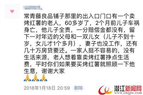 记者看到,在潜江市民的朋友圈中,这条带着温度的信息还在被不断地转发,如果您经过王爷爷的红薯摊,也请给这个支离破碎的家庭一点爱的温暖。
