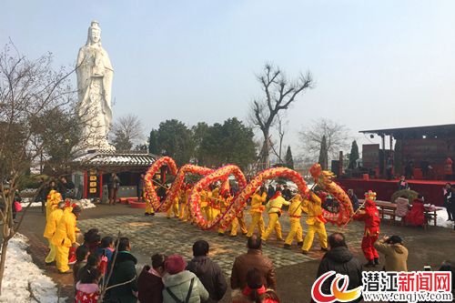 1月30日早上,积玉口镇借粮湖村的广场上,欢乐的锣鼓震天响,金色的巨龙在空中盘旋,现场气氛活跃,吸引了众多村民参与,表演者们用自己出色的技艺博得了现场一阵阵的叫好声。演出活动在热闹的舞龙表演中拉开序幕。