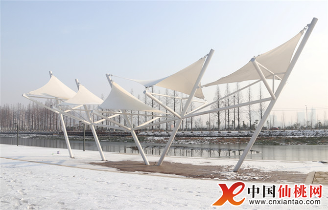 1月30日早上,寒气依旧、淡淡蓝天、阳光闪现,白雪装饰下的前通河滨水景观带似一幅立体的国画,井然有序的树木、青石色的桥身、红色的栈道、淡黄色的木屋、白色的廊道勾勒出画的轮廓和内容,其它地方皆留白,淡然精致、简单迷人,吸引不少市民游玩留影。