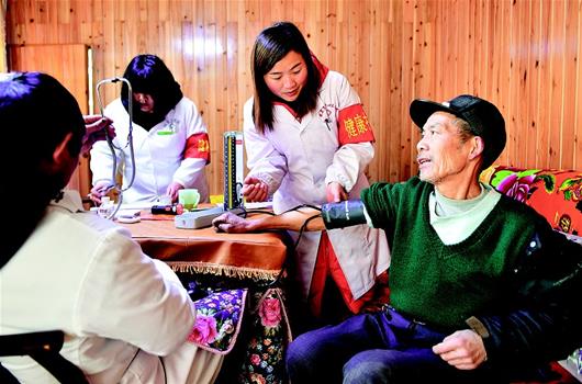 湖北日报讯 2月2日,宣恩县晓关乡健康扶贫队的医护人员在野椒园村为贫困村民进行健康服务。1月初,宣恩县组建45支由县、乡、村医护人员组成的“健康扶贫暖心服务队”,队员们走村串户,为建档立卡贫困农民进行健康检查,建立健康档案,宣讲健康知识,至今已有8000余农户受益。