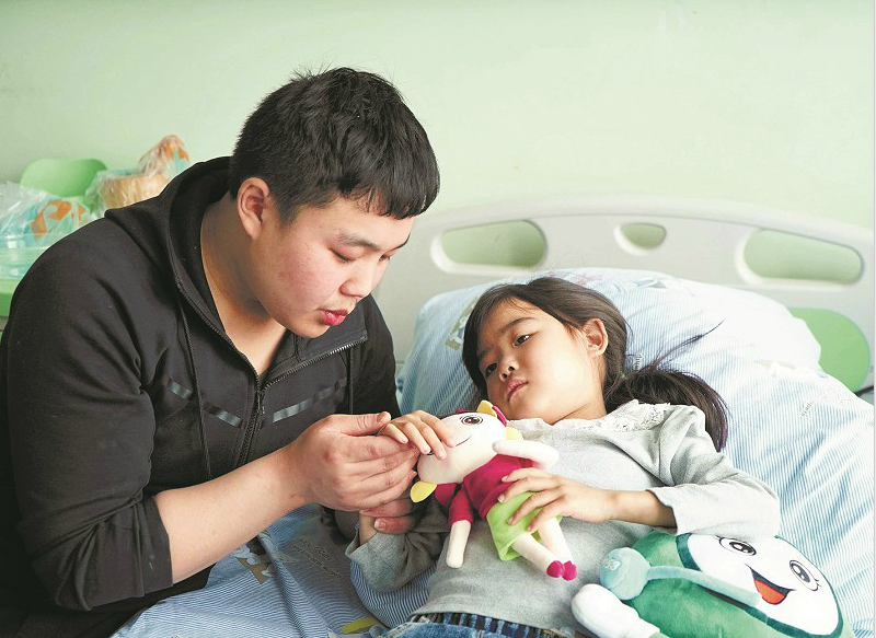 图为:周龙在病床前照料妹妹