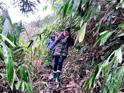 20年无人行走的路,满是灌木和荆棘,很难下脚,雨后的路湿漉漉的,很滑。带路的村民用镰刀砍掉绊脚的树枝和箬叶,队员一个紧跟一个向前艰难迈进。