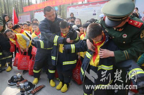 图为公益小天使体验穿战斗服。杨会摄影。