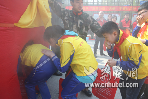 在疏散逃生演练区,消防公益小天使们在消防官兵的带领下从逃生帐篷中有序“逃生”。来自仙桃小学四(5)班的公益小天使荣绪耀在体验后心有余悸,“里面好像鬼屋,有呲呲的声音和烟,有的地方红的,有的地方黑的。”通过活动他学到了逃生方法,“就是捂住口鼻、弯下身子,跟着逃生标志走。”
