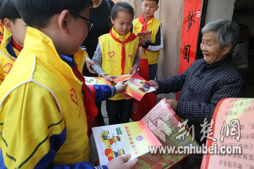 图为公益小天使们为社区居民赠送消防知识手册。杨会摄影。