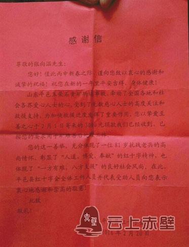 “尊敬的张向温先生,您寄来的3000元捐款我们已经收到,在此,平邑县红十字会全体工作人员并代表受助人员向您表示衷心地感谢和崇高的敬意……”这是山东省平邑县红十字会于2016年给张向温寄的感谢信中的一段话。