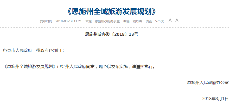 据了解,这份《恩施州全域旅游发展规划》经过了恩施州人民政府的同意,并于2018年3月1日下发到各县市人民政府、州政府各部门。