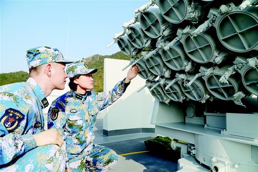 杨扬的岗位是副作战长,她来到舰首指着火炮介绍,她的职责就是指挥火炮手进行射击,包括观察、瞄准、发令以及处置突发情况等。“大学里我学的是机械设计和自动化,可以说对军舰火控系统一无所知,所有知识都必须重新学,这对我来说也是很大的挑战。”杨扬说,她也没想到自己一开始就和枪炮打交道。“她是支队首位女副作战长,在支队女军官担任作战指挥员没有先例。”舰长彭澎介绍,杨扬作为国防生分配过来后,这是第一个岗位。虽然是很年轻的女军官,但杨扬有韧劲、肯吃苦,而且很虚心,一开始就以新兵的姿态熟悉岗位,一边学理论一边观摩,态度非常认真。靠着这份付出,她对角色转换适应很快,现在已经可以在作战过程中履行职责。