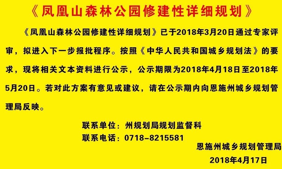 近日,恩施州城乡规划管理局对《凤凰山森林公园修建性详细规划》进行了公示。