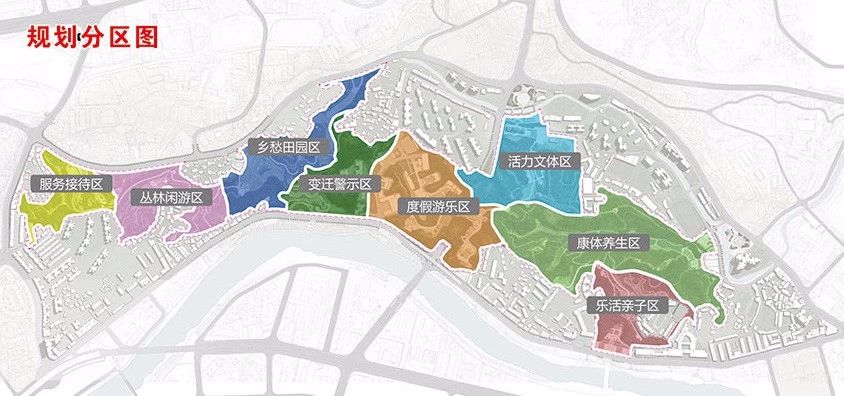 规划保留现状游乐园和华龙村度假休闲的功能,打造度假游乐区,对现状景观进行梳理提升,设置凤凰山欢乐谷,并结合现状建筑基址布置森林咖啡屋等商业服务设施,在视野良好的区域设置观景平台,为市民及游客眺望城景服务。