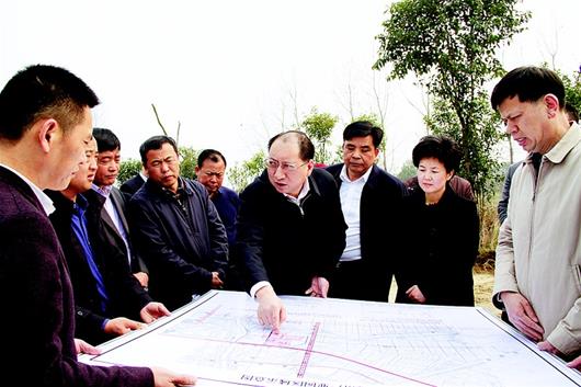 图为:仙桃市委书记胡玖明(右四)、市长周文霞(右二)在调研循环经济产业园建设准备工作。