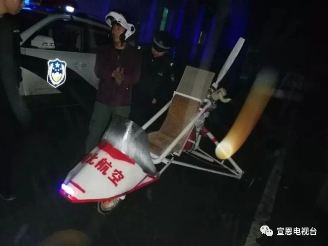 近日,宣恩县公安局椿木营派出所民警发现,一个像车子又像飞行器的装置,从集镇街道上一闪而过,民警随即进行了拦截,结果发现是一辆疑似飞行器,车尾装有一巨型螺旋桨高速转动,车头还印有“湖北航空”字样!!!